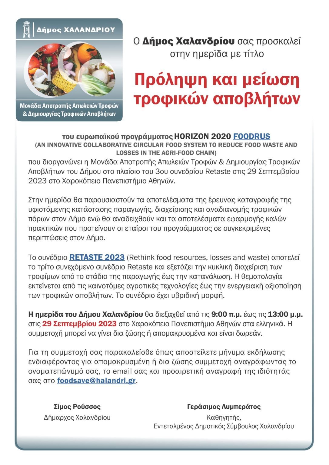 Η ημερίδα πραγματοποιείται στο πλαίσιο του 3ου συνεδρίου Retaste στις 29 Σεπτεμβρίου 2023 στο Χαροκόπειο Πανεπιστήμιο Αθηνών. Διοργανώνεται από τη Μoνάδα Αποτροπής Απωλειών Τροφών & Δημιουργίας Τροφικών Αποβλήτων του Δήμου, που λειτουργεί στο πλαίσιο του ευρωπαϊκού προγράμματος HORIZON 2020 FOODRUS